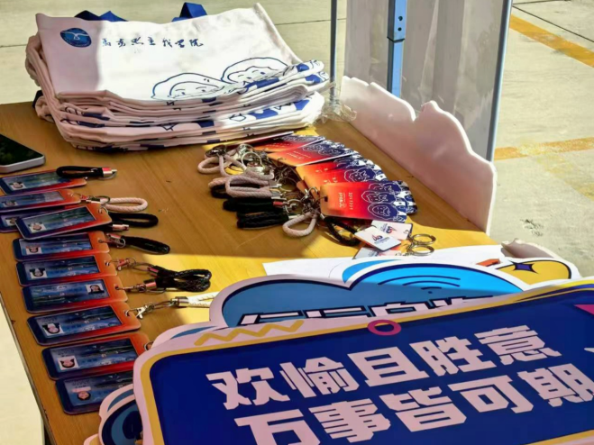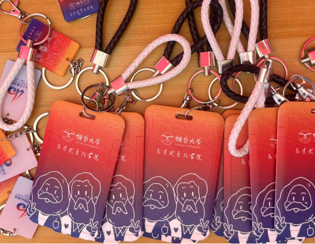 四十周年校庆相关的钥匙扣、卡包等文创产品。