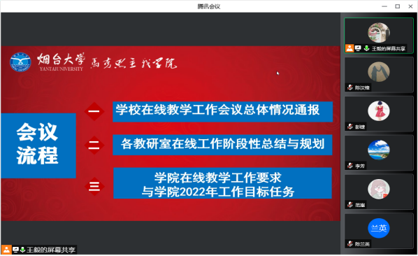 会上,王毅首先传达了学校“3.23”线上教学会议精神,尤其是近期校领导、教务处关于教学工作做出了部署和要求,指出要严格落实在线教学制度化,强化线上教学质量监控,实现督导随堂听课常态化等遵循;马克思主义基本原理教研室张旭主任、马克思主义中国化教研室岳素芳主任、思想道德与法治教研室彭婕主任、中国近现代史纲要教研室苏鑫主任、形势与政策教研室刘会清主任在会上分别从课程出发,就前期线上教学积累的经验进行分享,对遇到的问题进行交流,并对下一步线上教学工作提出建议、计划和措施。大家一致表示,疫情期间,虽有困难,但一定会提高政治站位,积极担当作为,甘于奉献,共克时艰,保持教学目标不变、教学标准不降、教学力度不减、教学效果不打折扣。王毅院长对全体授课教师表示肯定,要求老师们继续加强政治意识,严守政治纪律,做到课堂讲授有纪律、公开言论有规矩,要进一步明确学生考勤管理责任。各教研室要加强集体备课实效性,做到“四个统一”(统一备课、统一课件、统一思想、统一平台)。学院也将持续加强督导密度,提高督导实效性,继续组织系统的线上教学培训,全力保证高质量完成线上教学的质量和效果。