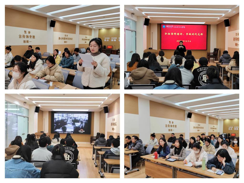 本次活动主要以座谈会的形式开展。在座谈会上,主持人郝伟简要介绍雷锋的生平事迹,组织同学们观看毛主席为雷锋同志的亲笔题词,重温雷锋语录,学习雷锋精神的深刻内涵,理解新时代弘扬雷锋精神的重要意义。雷锋同志是时代的榜样,人民的榜样,同学们一起观看影片《学习雷锋精神薪火相传》深入了解雷锋同志的光辉事迹。影片结束后,同学们对雷锋精神有了更深刻的理解,纷纷表示要学习和弘扬雷锋不怕吃苦、无私奉献的伟大精神。胡婷婷、张雪莹、夏宇辉、李淑伟等同学相继分享了自己对雷锋精神的感悟。其中,胡婷婷同学从雷锋同志的英雄事迹出发,分享了对雷锋精神具体内容的深刻理解,雷锋同志具有崇高理想和坚定信念,他服务人民、助人为乐,锐意进取、自强不息,艰苦奋斗、勤俭节约,是我们新时代学生的榜样。张雪莹同学讲到:“雷锋,他不仅仅是一个名字,更是一种精神,一座丰碑,感召一辈辈人不计小我,成就大我;激励了一代代人多行善举,不做恶行。他在雨中来,于晴中去,很久以后他的痕迹会慢慢淡去,但精神不会终止。”新时代的我们理应学习雷锋的这种精神,真学、真懂、真信、真用马克思主义,筑牢信仰之基、补足精神之钙,淬炼思想、涵养正气、升华境界、指导实践,急他人之所急、想他人之所想,争做奉献社会的模范。