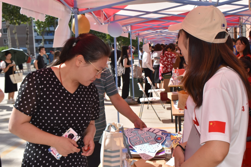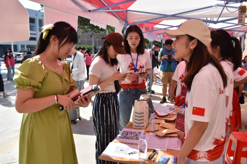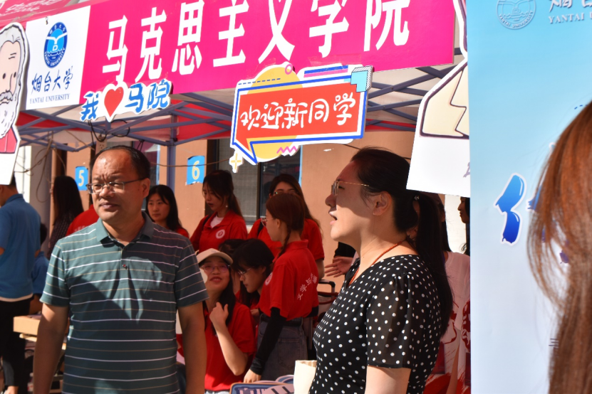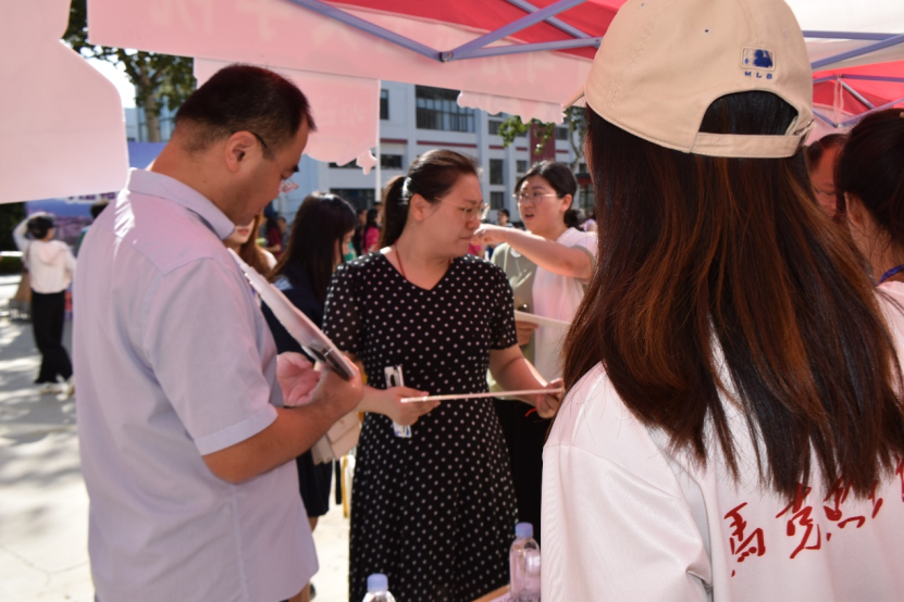 迎新现场,迎新志愿者耐心地为新生答疑解惑,有条不紊地帮助新生办理相关手续。学院党政领导、研究生秘书、辅导员在迎新现场,与新生亲切交流,询问报到情况。
