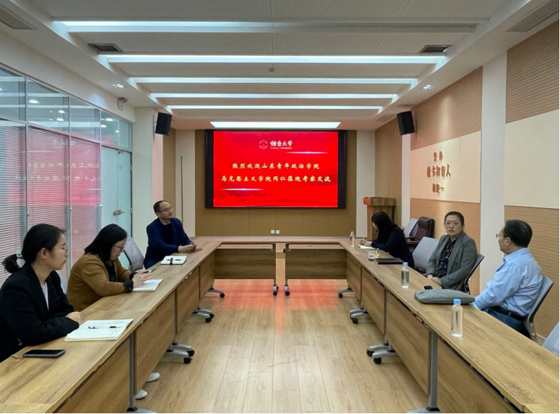 王毅代表学院对山东青年政治学院马院来访交流表示热烈欢迎,并重点介绍了学院基本情况及教学科研、团队、学科建设等方面取得的成果。刘丙元介绍了山东青年政治学院马院的办院情况、学院特色、学科建设、本科生教学及管理等方面的成果。随后,双方着重从本科生公共课及实践活动、青年教师培训与培养、学生教育管理等方面展开交流研讨,并达成一定合作意向。