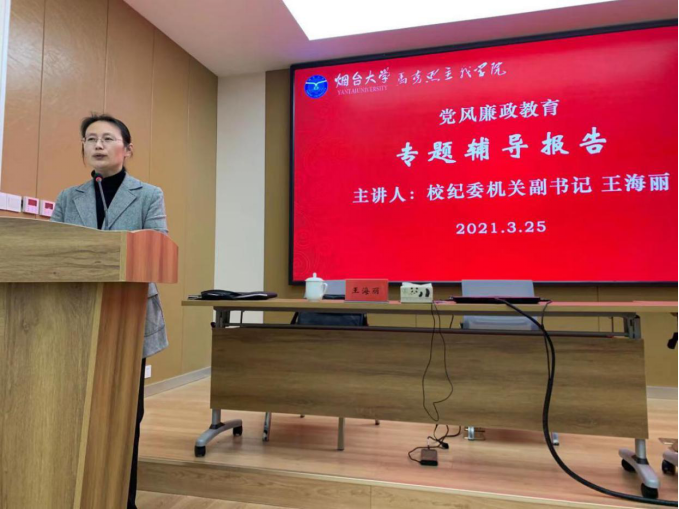 校纪委机关副书记王海丽讲授了《以案明规、以案说纪,做新时代明规守纪的合格党员、教师》廉政报告。王书记报告围绕立德树人根本任务,利用十八大以来在中央纪委国家监委网站、教育部网站等官方网站通报的高校党员、干部、教师违规违纪违法案件,以及2018年省委巡视以来学校典型案件,从师德师风警示、学术科研警示、财经纪律警示、违反中央八项规定精神、工作不力问责警示等方面,开展警示教育,宣讲有关党规党纪和法规制度,以案明规、以案说纪。