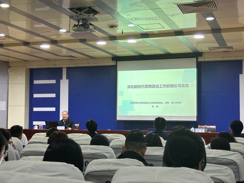 领导班子成员及全体思政课教师和研究生参会,聆听了教育部思想政治工作司原司长、北京师范大学思想政治工作研究院院长冯刚教授作的题为《深化新时代思想政治工作的理论与实践》专题报告。