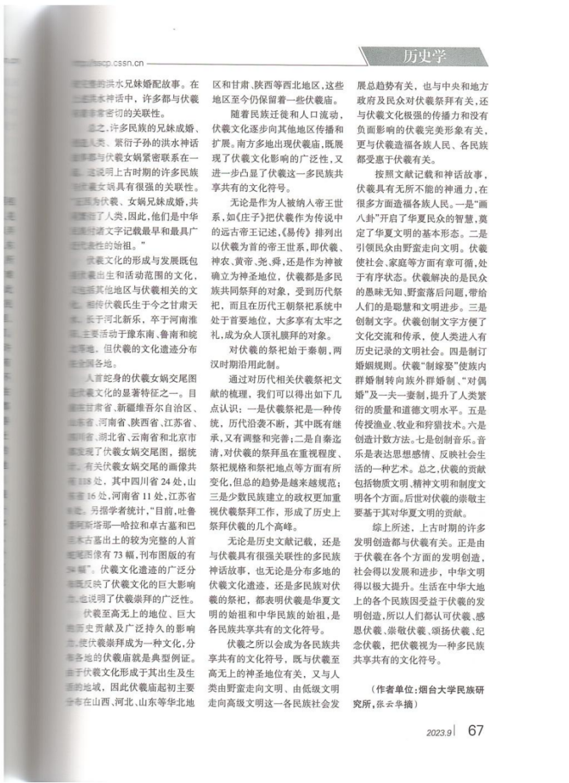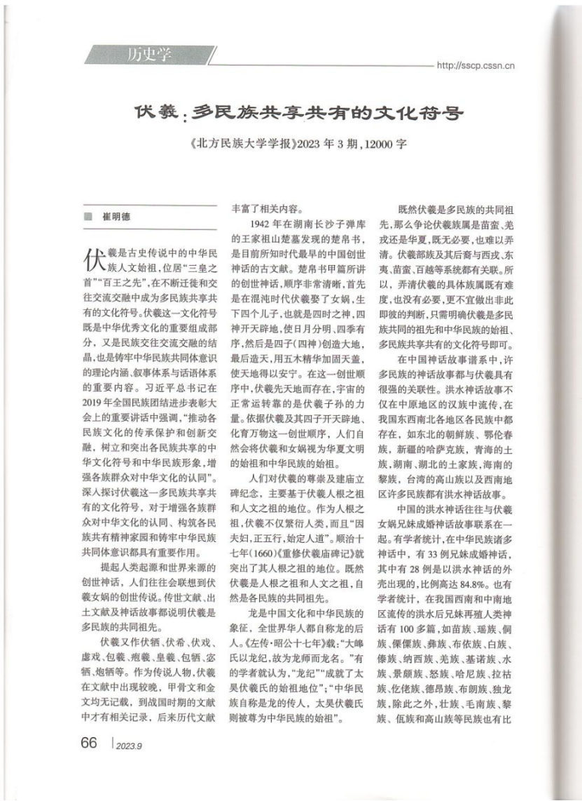 崔明德教授发表于《北方民族大学学报》2023年第3期的理论文章《伏羲:多民族共享共有的文化符号》。