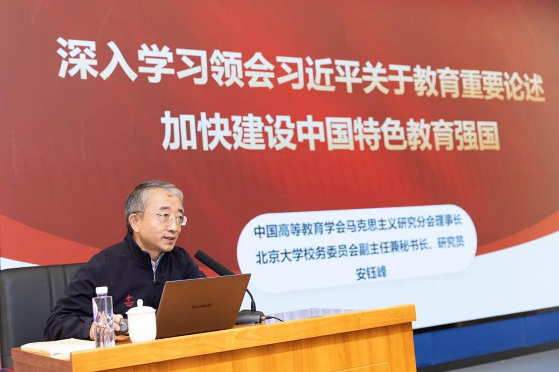 11月9日,中国高等教育学会马克思主义研究分会理事长、北京大学校务委员会副主任兼秘书长、北京大学工会主席安钰峰做客“北大、清华两校名师讲堂”,作题为“深入学习领会习近平总书记关于教育的重要论述 加快建设中国特色教育强国”的学术报告。报告由成人论坛